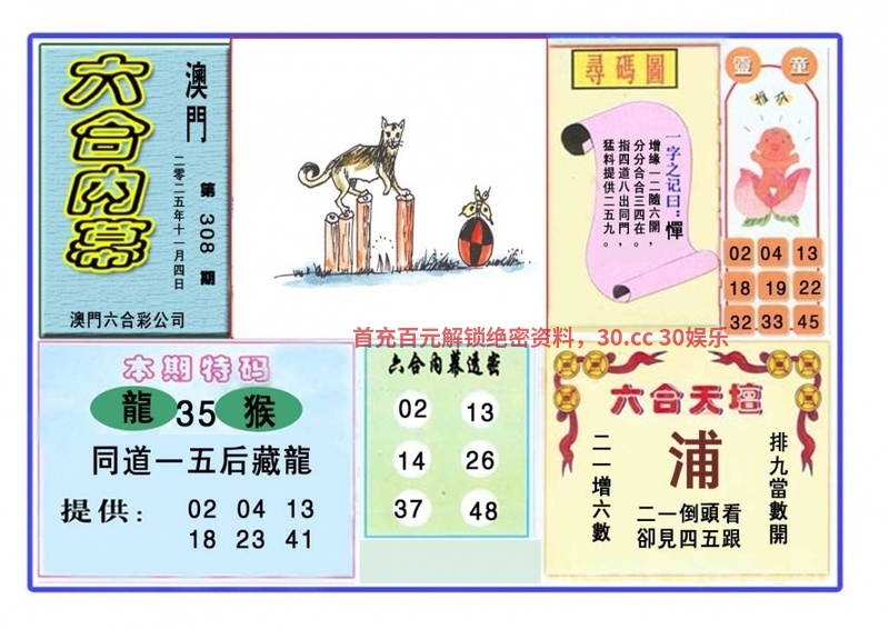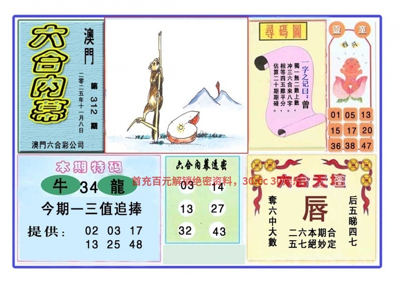 313期:六合三怪/内部平特诀/独家六合玄机/六合对诀/波色输尽光